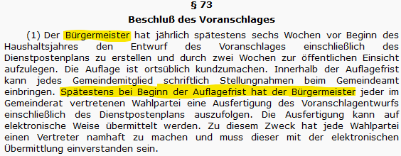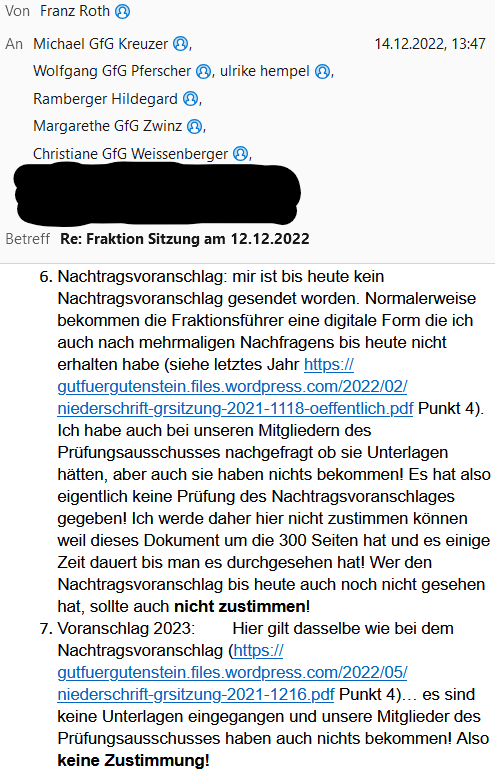 Der Voranschlag 2023 wurde nicht 3 Tage verspätet zugesandt, sondern überhaupt nicht!! Für die Ausfolgung des Voranschlages ist (laut Gemeindeordnung) ebenfalls der Bürgermeister zuständig und nicht die Amtsleitung!